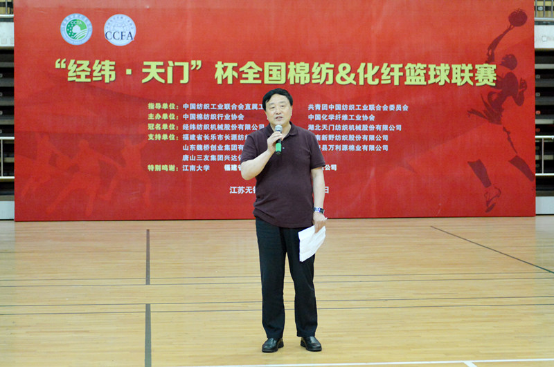 作為本次比賽的兩家冠名單位,中國紡織機械(集團)有限公司工會主席庫冠群代表經緯紡織機械股份有限公司致辭,湖北天門紡織機械股份有限公司黨委書記魯德文在致辭中表示:天門紡機應邀參加本次聯賽,并有幸成為冠名單位之一,旨在以籃球的名義為促進紡織文化的交流盡綿薄之力。