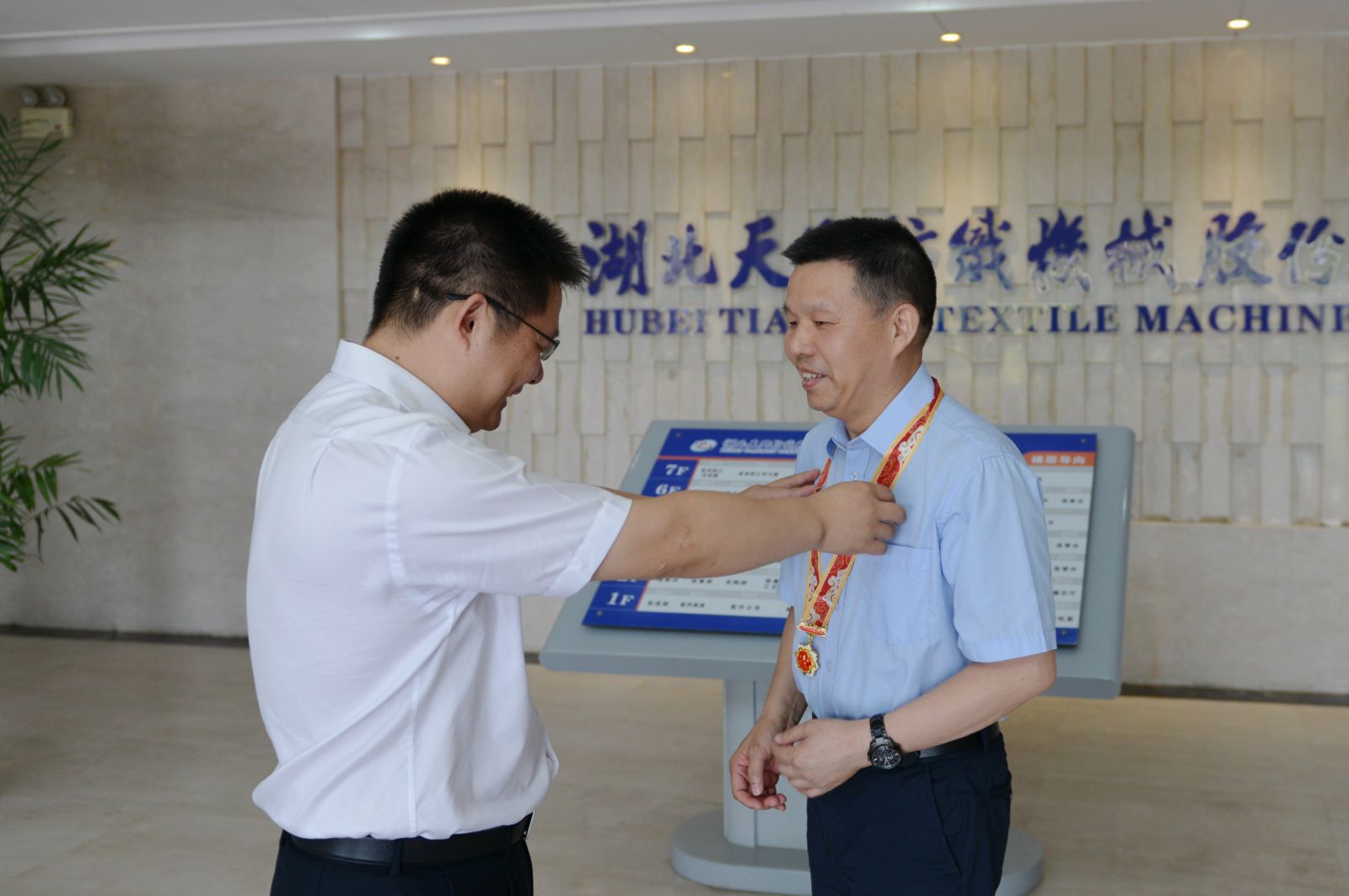 9月30日上午,天門市委、市政府及總工會相關領導來到天門紡機,為董事長沈方勇頒發由中共中央、國務院、中央軍委授予的“慶祝中華人民共和國七十周年”紀念章,并與沈方勇董事長親切合影留念。