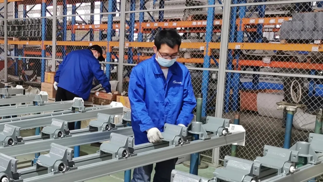 裝配工曾獻軍對裝箱的導條架進行檢查