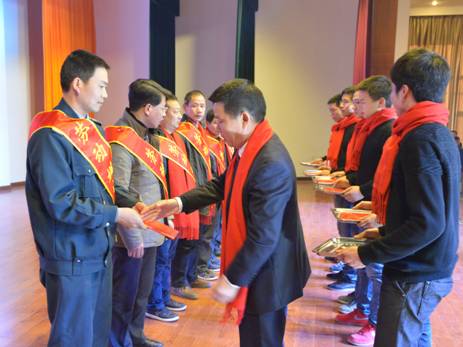 在工作中成績突出,楊吉學多次榮獲公司勞動模范和先進工作者榮譽,圖為沈方勇董事長為勞動模范楊吉學頒獎