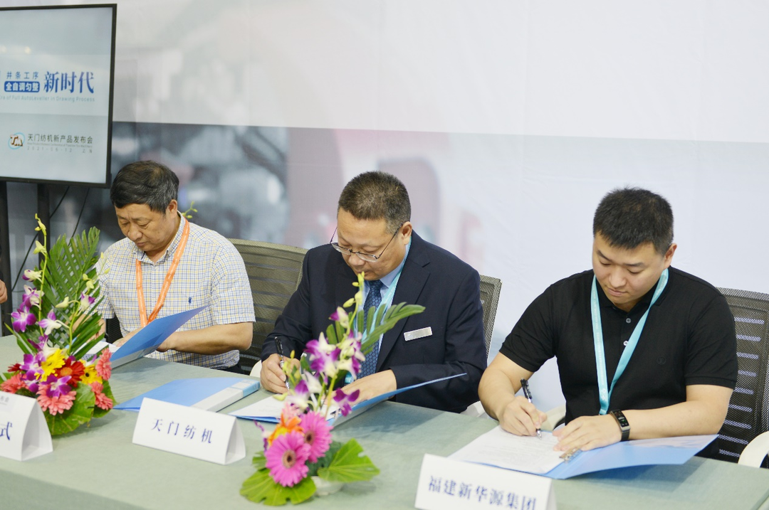 發(fā)布會(huì)上,TM15、TM19首批客戶福建新華源紡織集團(tuán)有限公司、湖北妙虎紡織有限責(zé)任公司等紡企,與天門紡機(jī)現(xiàn)場(chǎng)簽訂戰(zhàn)略合作協(xié)議,將在“并條工序全自調(diào)勻整”深度合作、攜手共進(jìn)。