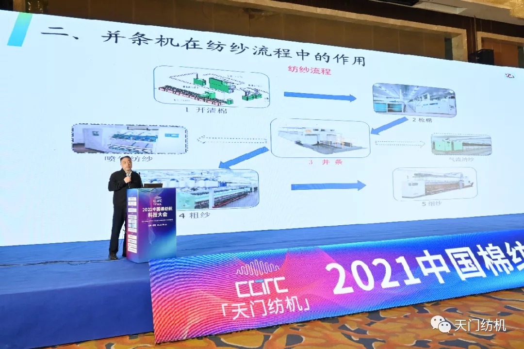 湖北天門紡織機械股份有限公司總經理焦倫進作了《并條機的創新與未來》的專題報告。在報告中,焦倫進總經理介紹了并條機在紡紗流程中的作用,并就目前紡織企業對并條機創新的要求,從傳動結構及精度、加壓系統、牽伸裝置、清潔系統、部件及提供設備的數字化、信息化、智能化水平等方面進行介紹。最后,焦倫進總經理指出未來并條機將向著梳并聯合、并粗聯、短流程一體機在技術上的突破方向發展。