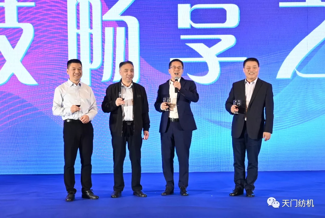 在12日的天門紡機“科技暢享之夜”答謝晚宴上,天門紡機總經理助理楊文峰致詞。中國棉紡織行業協會會長董奎勇,天門紡機總經理焦倫進,全國棉紡織科技信息中心主任、《棉紡織技術》期刊社社長劉強,天門紡機總經理助理楊文峰共同為晚宴祝酒。