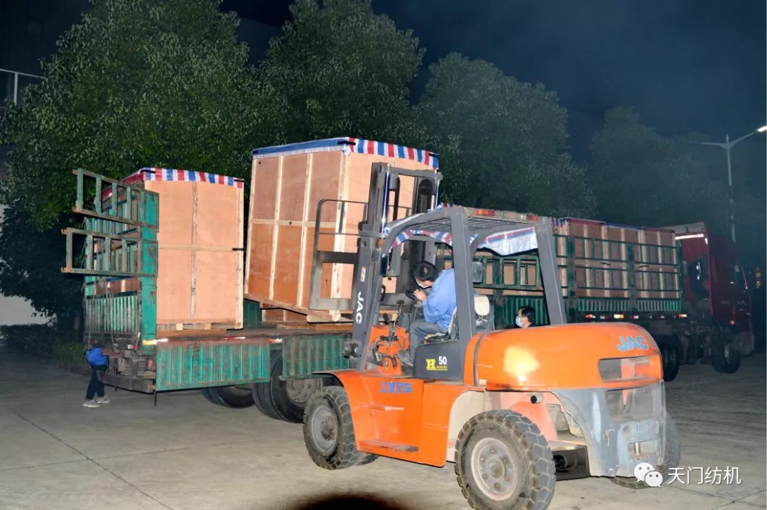 燈火闌珊處,機器轟鳴聲。已是臘月二十一的晚上,天下著冷冷細雨,神州大地處處已有年味,但在天門紡機廠區仍然一派繁忙景象:數萬平米的車間內全都燈火輝煌,工人們緊張有序的在工作;車間外,幾輛大貨車一字形排開,正在上貨發往淮北華孚和魯泰紡織。