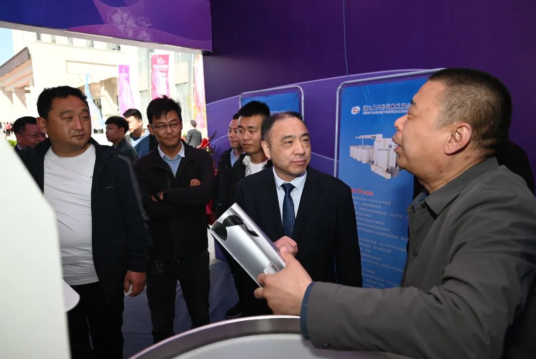 天門紡機(jī)總經(jīng)理焦倫進(jìn)向蒞臨公司展位的晉州市長(zhǎng)王林(右2)、中國(guó)服裝協(xié)會(huì)常務(wù)副會(huì)長(zhǎng)楊金純(右1)、晉州市紡織服裝行業(yè)協(xié)會(huì)會(huì)長(zhǎng)李永強(qiáng)(左1)介紹公司與晉州紡織企業(yè)合作情況