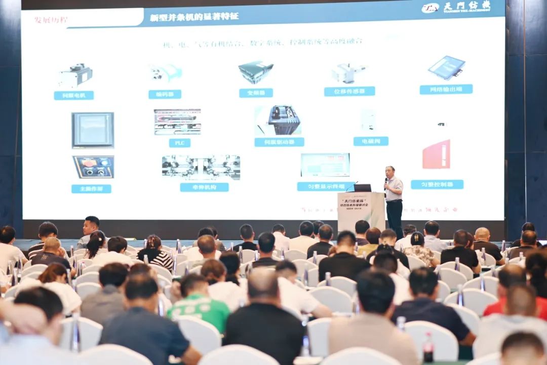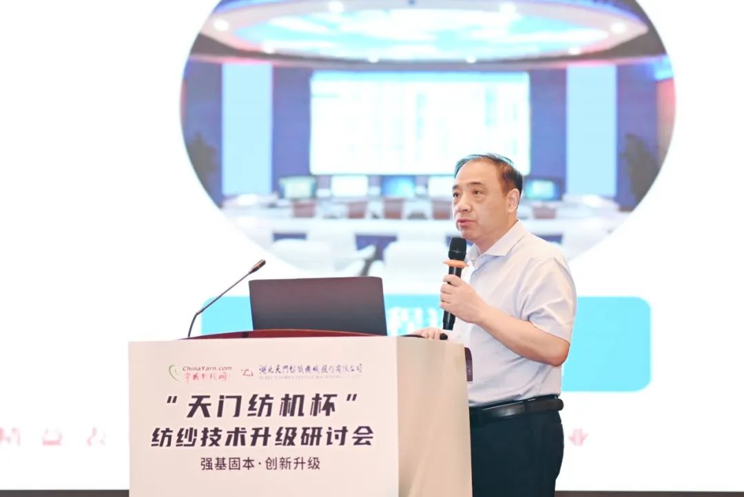 天門紡機總經理焦倫進向蒞臨會議的領導、嘉賓及長期關心支持天門紡機發展的各界同仁朋友表達了誠摯的謝意,他表示,天門紡機“生產制造柔性化、倉儲物流自動化、信息管理現代化”的5G+智慧工廠項目正在不斷向前推進,我們將通過自身的數字化轉型與智能化改造,為紡織企業數字化轉型和智能化改造持續提供裝備基礎。并作了題為《并條機的創新與應用助力紡企高質量發展》的專題報告。他交流了天門紡機堅定不移走“專精特新”之路的工作經驗,分享了勻整控制、在線監控、5G+物聯網、自動熱交換降溫系統等技術創新成果。