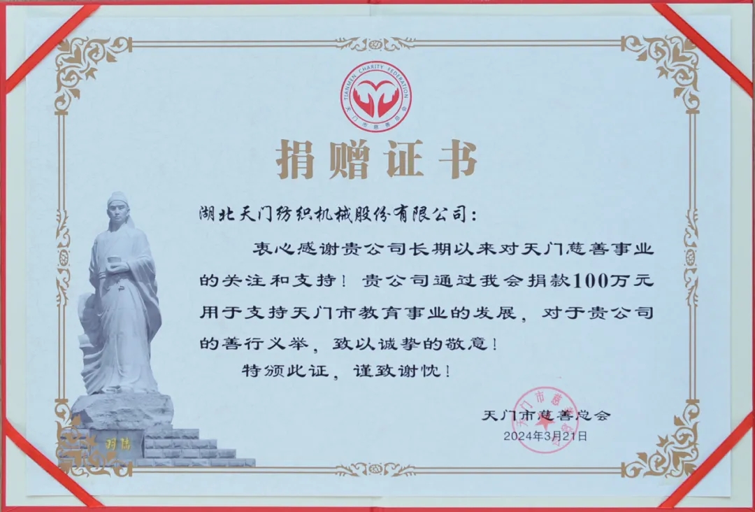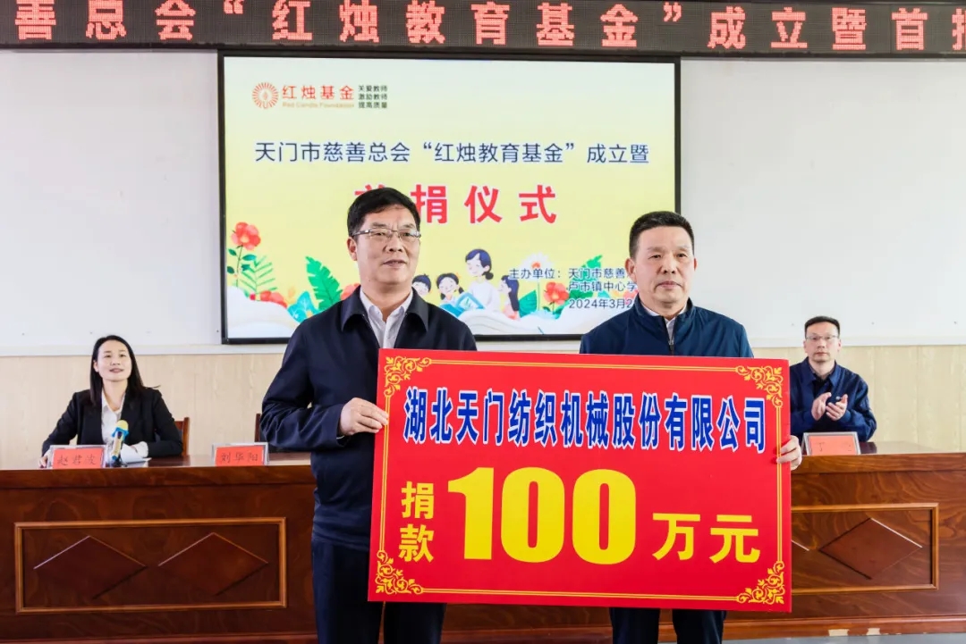2024年3月21日,天門紡機董事長沈方勇出席在天門市盧市鎮盧家口中學舉行的天門慈善總會“紅燭教育基金”成立暨首捐儀式,同天門市慈善總會、教育局三方簽訂了《天門市慈善總會“紅燭教育基金”協議書》,并現場捐贈100萬元,用于獎勵盧市鎮優秀教師和幫扶困難教師等公益活動,助力盧市鎮教育高質量發展。天門市人民政府副市長古玉麗,天門市民政局局長、市慈善總會會長謝金才,天門市教育局局長劉華陽,天門市慈善總會秘書長李貴清,盧市鎮宣傳統戰委員劉恒超以及盧市鎮部分教師代表等參加首捐儀式。盧市鎮黨委書記趙君波主持儀式。