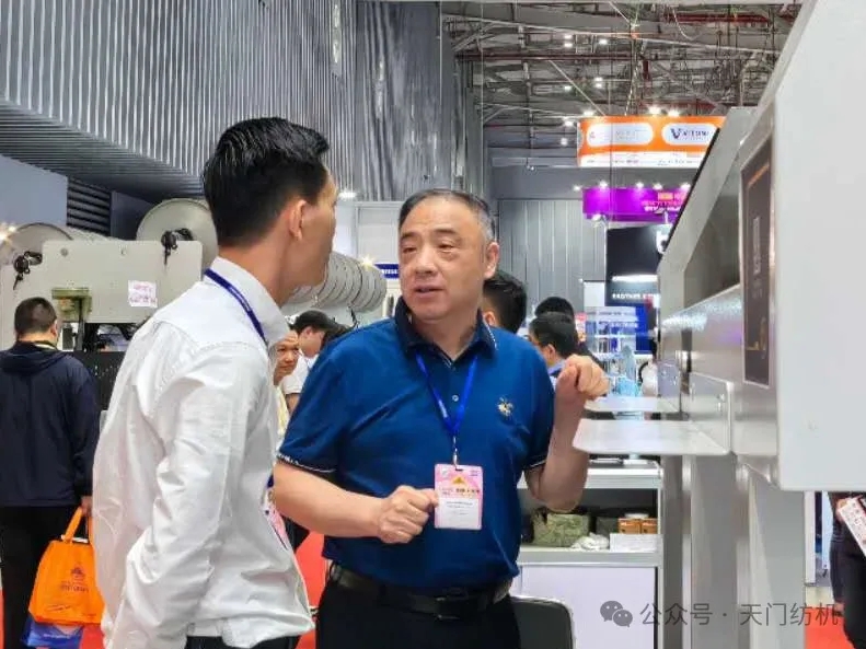 越南展會現場人流如織,其中天門紡機展區(qū)尤為矚目,開展期間分別迎來HANO SIMEX、VICOTEX、HONG LINH、NHA TRANG、THANG CONG、PHU BAI等50余家越南紡企的到訪,T1系列并條機憑借卓越性能表現,引發(fā)現場觀眾駐足,多位老客戶對T1系列并條機的穩(wěn)定性與高效產能給予高度評價。